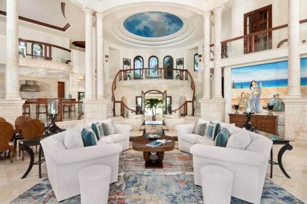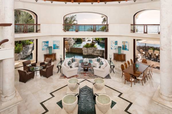 The three-story library known as a “million-dollar room” built with mahogany paneling and a hardwood helical staircase offers a one of a kind private workspace and sitting area. The third-floor cocktail lounge and sitting area provide magnificent views of Chalk Sound and Silly Creek.